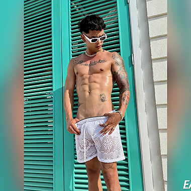 "Latin muscle studs play by the pool"