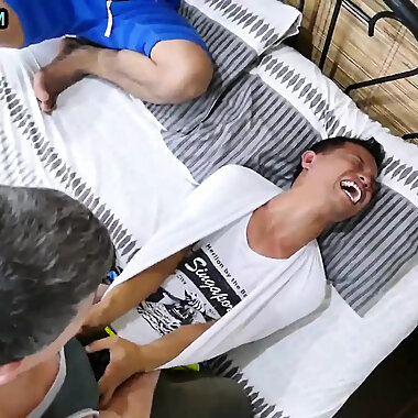 "Tickled Asian twink fucked in DILF 3some with his 21yo BF"