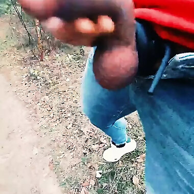 "Big dick nudist walking through the woods"