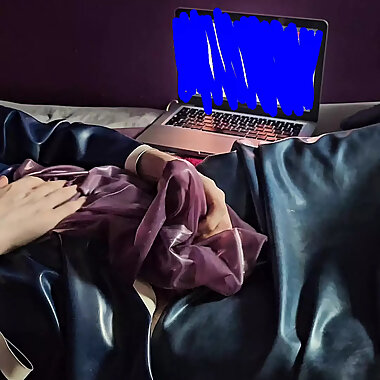 "Latex fetish addict jerking big cock to porn in latex robe with latex sheets big cock cumshot"